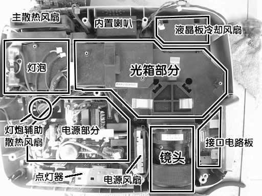 此时机芯已经暴露在面前,其主要组成为:除主板外,有接口电路板、光箱、镜头、灯泡、液晶板散热风扇、内置喇叭、主散热风扇、电源、高压点灯器、辅助散热风扇等(图5)。