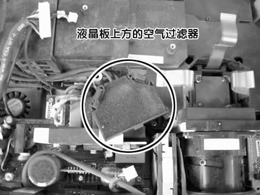 4.液晶板冷却系统仅使用较简易的单层滤网,且风路密封不好,易受灰尘沾染,使液晶板通光效率下降。