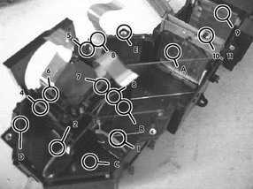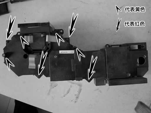注意:代表黄色的箭头所指部分是四块黑塑料片,其下面点了胶,用以固定光箱中的反光镜片,所以揭起光箱盖板动作一定要轻,千万不要将粘住的镜片带出摔坏或弄破。