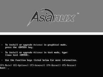 Asianux光盘启动画面和RedHat十分相像,更多的安装选项可以通过功能键F1~F5查看并加载。如果Asianux支持系统的显卡就采用图形化安装(直接回车),不支持就用字符界面方式安装。图1就是似曾相识的光盘启动画面。