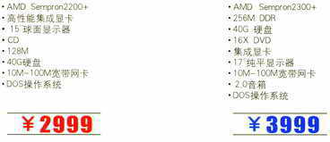 Intel的赛扬D最近可是春风八面,不过AMD不甘示弱,这不,7月28日才发布了针对赛扬D的Sempron(闪龙)处理器,这个周末百通就在电脑城看到了精彩的品牌机“龙羊大战”了!不信就来看看品牌机专卖店里MM给百通的宣传资料,呵呵,价格便宜量又足(如图)。