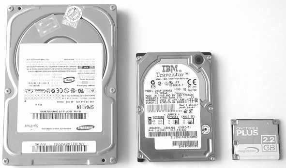 3.5英寸的三种不同尺寸的硬盘,从左至右分别是:台式机硬盘、2.5英寸本本硬盘,1英寸微型硬盘