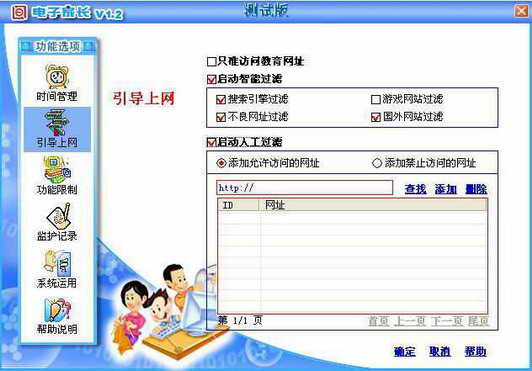 我们的第一个目的就是让小鬼不能再访问黄色网站,让那些网络毒瘤不再被小鬼们轻易点开。对于这个任务《电子家长》可以轻易完成。打开刚刚安装完毕的《电子家长》,选择“引导上网”这一项。这里面包含了“只准访问教育网”、“启动智能过滤”和“启动人工过滤”等选项(图1)。