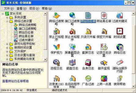 《网络爸爸》采用了网址过滤和实时网页内容过滤技术,用户可以根据需要设定不同的过滤级别,设有黑名单和白名单允许用户自己设定个别要禁止或者允许访问的网站地址,同时它也具有抓屏功能(如图)。