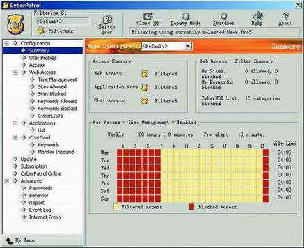 Cyber Patrol拥有强大的功能,除了过滤,你还可以设定多个使用者,为每一个使用者安排允许上网的时间段;设置过滤的文字;禁止订阅猥亵的新闻群组;禁止使用某些应用程序,并查看各自的上网记录。但要充分发挥它的作用你必须掌握它那令人畏惧的功能设置选项,由于软件没有中文版本并且功能设置选项较多,因此不容易上手,这也是“Cyber Patrol”最大的缺点。