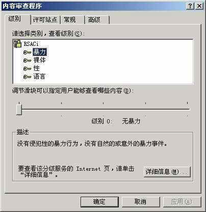 它的设置方法也很简单,只需要在“控制面板”中打开“Internet选项”,在“内容”选项卡的“分级审查”下单击“启用”按钮可以启用“分级审查”功能,此时将自动弹出“内容审查程序”对话框,在对话框的“级别”选项卡上单击语言、裸体、性和暴力列表中的任意一种类别,然后移动滑块设置要使用的限制,默认设置是禁止所有属于这个类别的网站,设置完毕后单击“确定”按钮,系统会提示你创建密码,以后更改任何“分级审查”设置都要用到该密码(图5)。