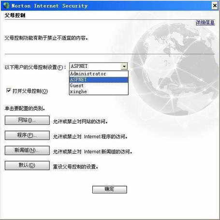 设置好账户后,我们可以为不同的账户设置不同的访问权限。用超级账户启用《诺顿网络安全特警》,在主界面中双击“父母控制”,即可进入“父母控制”配置界面(图6)。