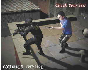 我是一CS爱好者,所以平时也从网上下载了一些CS图片,一天拿着朋友旅游带回来的一把军用匕首,突发奇想,于是叫朋友帮自己照了一张手持匕首的匪徒照片(现实生活中咱可是好人),然后用网页三剑客的 Fireworks 软件将照片中的自己用绳索工具套取复制下来,并用橡皮擦工具去掉边缘多余的锯齿,然后放到一张选好的CS图片上,将原来的“匪徒”上半身覆盖,再将周围多余无法覆盖的画面放大后,复制别的地方的颜色和部分背景来遮盖掉这些多余画面,于是得到这一幅拼凑出来的CS搞笑图片。