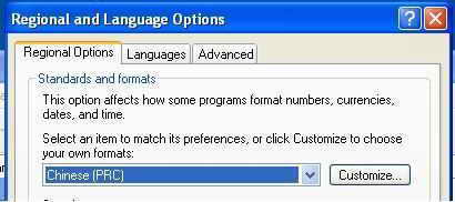 2.在Regional Options(区域选项)页面下将Standards and formats(标准和格式)的下拉项中的格式选择为Chinese(PRC),如图1。