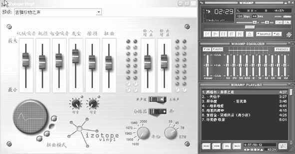 还记得小时候听过的那些嘎吱嘎吱发响的旧唱片吗,上个世纪60、70年代的人听到这些用老式唱机放出来的歌会会心地一笑。想再重温这些带有几分岁月沧桑的声音吗?其实只需要Winamp以及Winamp的插件iZotope Vinyl就可以了。这个插件使用电子模拟技术,在音乐中加入磨擦声和机械声,给人感觉就像在听老唱机了。如果调节“擦损”和“灰尘”滑杆能产生较好的效果。