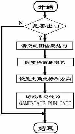首先要把地图结构清空,再把当前地图的名字(不是MapStruct.mapname,场景类CScene有一个变量保存了当前的地图名字)改为目的地图的名字(即ExitStruct.m_chMap),然后把主角的坐标改到目的场景后的坐标,方向也要改。最后把游戏状态改为GAMESTATE_RUN_INIT,这样就会再次进行初始化场景,而载入的就是新的地图文件,进而就实现了场景切换。程序流程图如图1所示。