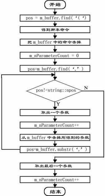 为游戏脚本类CScript添加一个分析脚本函数AnalyzeScript()。也就是图2中的“分析脚本”部分。它的作用是分析每一句脚本所执行的是什么脚本命令,分析出它的参数,最后调用该脚本命令的执行函数。