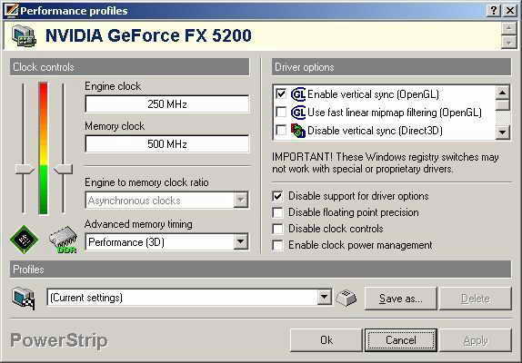 这次超频的对象是GeForce FX 5200(以下简称FX5200),打开PowerStrip,选择“Performance profiles→Configure”,在显卡工作频率对话框中能看到显卡出厂默认的核心频率为250MHz,显存频率为500MHz(如图1)。对FX 5200超频,只需要调整拉杆重新设定显卡的核心频率和显存频率,设定完成后,点击Apply保存即可。