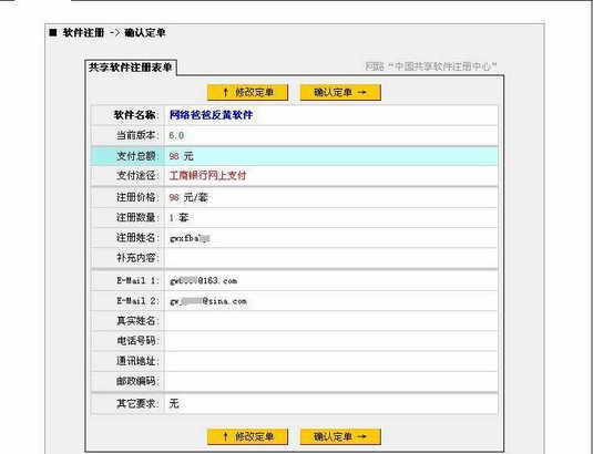 当这些都完成后,点击下方的“提交表单”按钮,会出现“网路中国共享软件注册中心《用户协议》”页面。看过协议内容后,点击“同意用户协议”按钮进入下一步,会出现确认定单页面(图1)。若表单内容填写不完整或有错误,就可以点击“修改定单”按钮返回修改,否则点击“确认定单”进入下一步;此时,会有一个定单号及订购信息,注意一定要将定单号记住,以备查询使用。