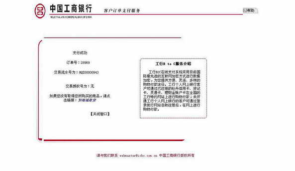 点击网页中的“到‘工商银行网上支付’平台”按钮即可进入支付平台了,真正掏钱的时刻就要来了。进入了工商银行客户定单支付页面,可看到收款方的名称、定单号、付款金额。当填入自己的工行卡号码及密码后,点击“提交”按钮,即可出现确认页面,若所显示的信息没有错误,则可点击“提交”按钮。当出现一个支付成功的页面时(图2),就意味自己账户中已经自动转走金额了。