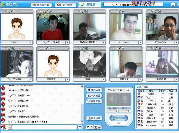 进入以后你就会看到很多视频网友图像(注意:必须安装摄像头才可以显示头像,摄像头的安装比较简单,在此笔者就不多说了),是不是很酷?如果想对哪个网友说话,只要点击右边的昵称,然后在左下角的文本框输入消息,回车即可发送消息。下面我们来看看具体的几个功能。