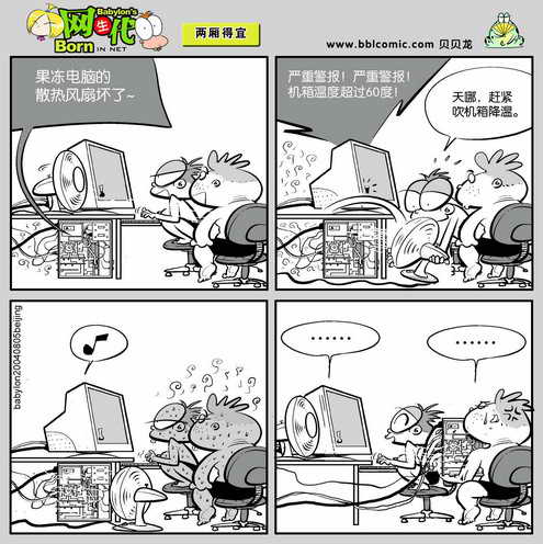 网生代(31):两全其美 网络通信 贝贝龙 · 2004年8月9日 编注:自网生代百期专题向读者征集漫画脚本以来,虫虫收到许多热心读者的投稿。作者贝贝龙为答谢读者,将自己设计的玩具作为奖品,赠送给漫画脚本被采用的读者。欢迎大家继续投稿,投稿信箱:chong@cpcw.com 本期漫画由Eric读者策划,除50元稿费外,他还将获得由贝贝龙独家设计制作的玩具魔法猪一个 (注:魔法猪是贝贝龙系列漫画《魔法猪世纪》中主角阿檬猪的玩具版,详情请参看贝贝龙主页“青蛙帝国”http://www.bblcomic.com)