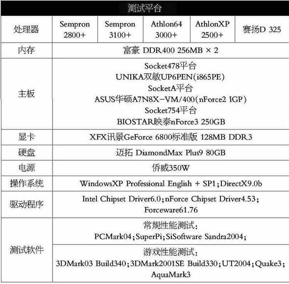 在SocketA平台上,我们使用了Athlon XP2500+和Sempron 2800+对比,同时还加入了赛扬D 325的测试成绩做对比;在Socket754平台上,我们采用Athlon64 3000+与Sempron 3100+作对比(P4 2.4A GHz的对比得分见I2版)。性能测试包括常规性能和游戏性能两方面,在这两方面测试中,同时包括系统整体性能和CPU单项性能测试。