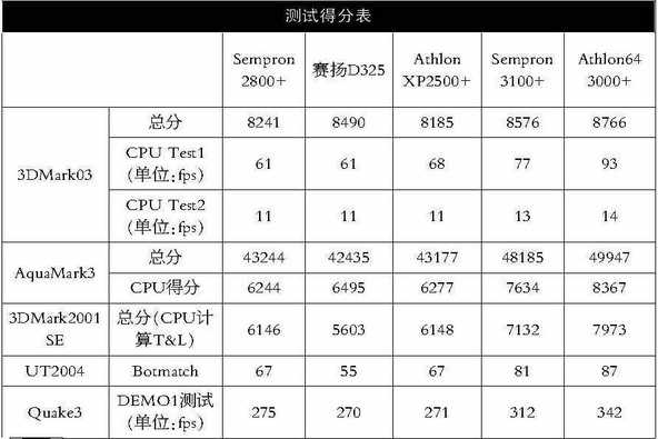 在这项测试中,Sempron 2800+以微弱优势超过了赛扬D 325和Athlon XP2500+,而在CPU得分中,赛扬D 325得分反超Sempron 2800+,两者各有得失。