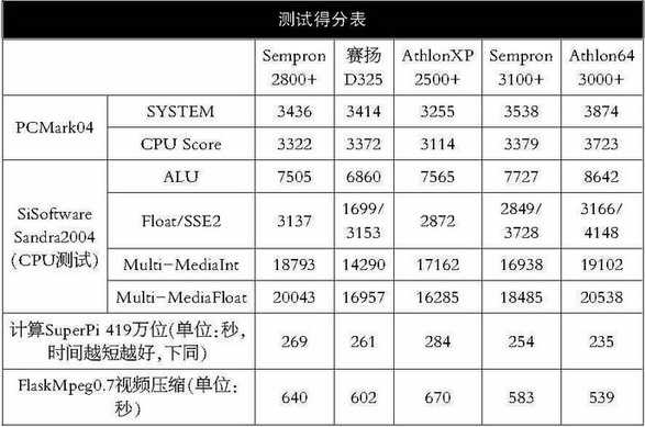 和老型号的Athlon XP2500+比起来,Sempron 2800+借助频率上的优势,总分略微超过Athlon XP2500+,不过Barton核心的Athlon XP2500+借助512KB的二级缓存在纯CPU测试中反超Sempron 2800+。这样的结果并不矛盾,总分包括了各个测试场景的成绩,而特定的场景对CPU的要求各有不同。而赛扬D 325的总成绩比Sempron 2800+要好,在CPU测试中成绩也与Sempron持平。