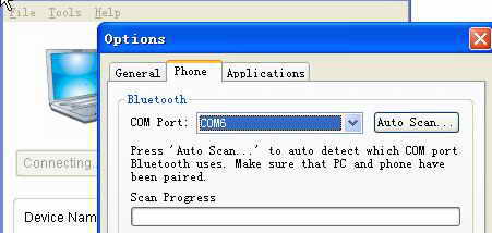 4.在Phone选项中,可以设置手机通过哪一个端口与电脑相连,这一点非常关键,设错了就无法与电脑连接,这时我们选择刚才查看的端口号。你也可以按右边的“Auto Scan”让电脑自动扫描(图2)。Applications 选项是用来设置Winamp的路径的。一切设置好后,按“确定”回到Jeyo Remote Server 窗口。