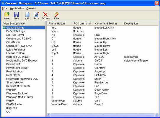 该程序窗口非常简洁,左边是一些常用的软件,右边列出了这些软件与手机上的各个按钮对应的各种按键操作。其中的“Global Settings”是全局设置的意思,任何一个被控制的软件如果没有特定的按钮操作,就会以全局设置为准。用户可以双击其中的一项进行更改,更改后保存,下一次连接就可以应用了。鉴于设置项太多,在此就不一一介绍了。