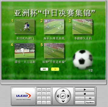 这次赛事选单我选择了几个精彩的片段(如李明的死角射门、李金羽头球失良机、邵佳一大力远射等)来作为视频开始画面的选单,如果我想看哪个片段只需要用遥控板按选单相应的数字即可(如图1所示)。有了选单,我们便能随心所欲地控制视频片段的播放了,对那些影片较长的视频这种方法非常方便。下面我们就来看它是如何制作的吧!