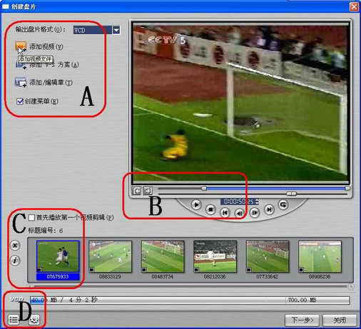 虽然从网上下载的李明破门的片段只有1分11秒,我还是把它分成了几个章节,呵呵,这样我就能从李明破门的环境直接切换到破门的瞬间了,呜呜,可怜天下球迷心。必要的话,还可从顶端下拉框中选择其他影片添加章节。在A部分的最后一项“创建菜单”,一定要选中,这可是点睛之笔。