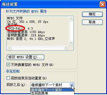 图4中指出部分是关于电视制式选项VCD-PAL,PAL和NTSC为电视的两种制式。NTSC为美国、加拿大、日本以及中美和南美部分地区的商业电视广播制订标准时,规定每秒30(29.97)个画面,显示525行。PAL制式采用的是逐行制式标准,每秒25个画面,625行,我国和大多数欧洲国家、澳洲以及中美和南美部分地区采用的是PAL制式。