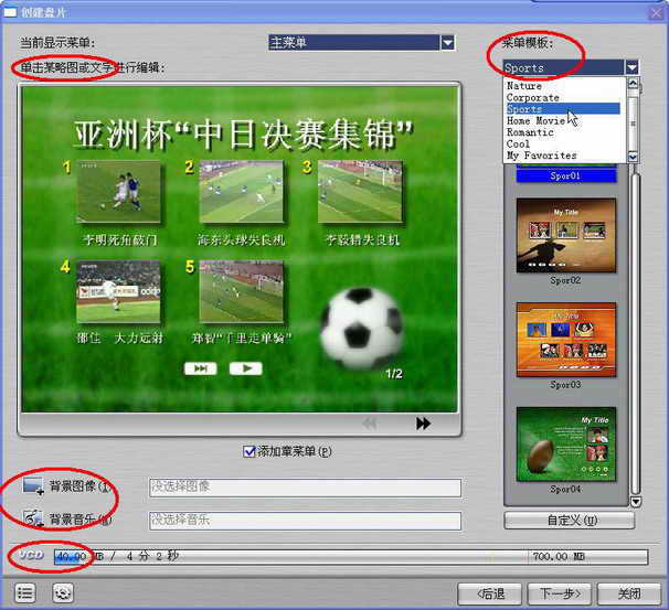 1.在右边的模板中我选择“运动01”模板,模板的背景“绿荫足球”正好和亚洲杯相吻合,免去了更换背景的步骤。读者可根据影片的主题选择合适的模板,在看中的模板上点击即可预览效果。在左下方给我们提供两个按钮“更换背景和添加音乐”。作为选单,停留的时间稍长,加上合适的背景音乐会使整个VCD气氛显得更温馨。