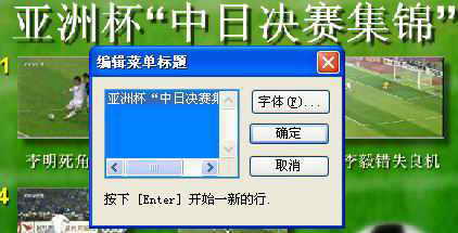 2.在预览窗口,单击文字可改变文字内容,我们将“我的标题”改为“亚洲杯中日决赛集锦”,使影片的意义更明白(图6),单击缩略图,然后拖动滑杆可改变菜单显示的图像。