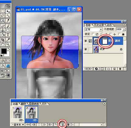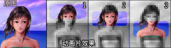 在学习矢量蒙版使用之前,我们先来制作一个有趣的小动画。这是矢量蒙版和形状工具的配合使用并结合ImageReady软件来完成的。动画效果如图1。随着滑条的移动,你可以看到模糊不清的马赛克后面靓丽的女孩。
