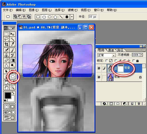3.点菜单“图层→添加矢量蒙版(有的翻译为添加剪贴路径)→显示全部”,在图层面板中可以看到复制的背景层增加了一个矢量蒙版的缩览图。然后在工具箱中选择形状工具中的“圆角矩形工具”在马赛克图片上画一个圆角长方形,你可以看到在你画的圆角长方形部分的马赛克不见了,显示出下面的图层图片(图2)。感觉这部分被删除了,实际上这就是矢量蒙版的作用将形状工具画的区域隐藏了。
