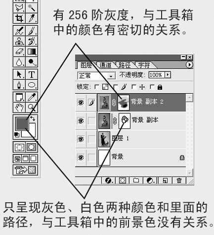 图层蒙版创建的灰度通道,在它的缩览图中有256阶灰度,它与工具箱中的颜色有密切的关系。而矢量蒙版的缩览图中只呈现灰色、白色两种颜色和里面的路径,与工具箱中的前景色没有关系。