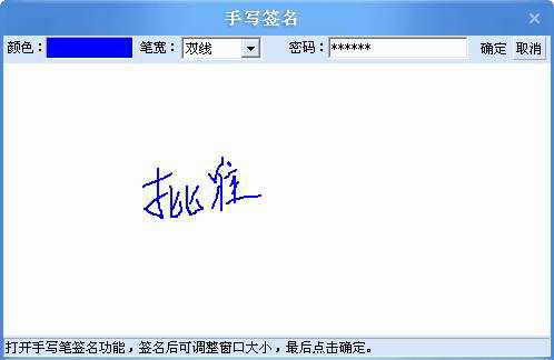 手写签名的输入设备一般是鼠标或者手写笔。有人可能会担心鼠标签名的效果,因为在Windows中的“画图”程序也可以通过鼠标来写字,但是效果非常糟糕,稍微一用力其中的笔画就会变形。但是在这个程序中鼠标签名的效果应该是很不错的,笔画一般不会产生变形。在弹出的签名窗口中完成输入之后,点击右上角的“确定”按钮就OK了。另外,为了防止别人随意更改签名,你可以为这个签名设置一个密码,