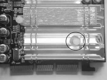 现在的主流显卡大多采用弹簧卡子和双面胶固定散热片。在这块显卡的散热片正面可以看到两个白色的圆形塑料柱,这两个圆柱就是固定散热片的弹簧卡子。翻到显卡的背面,用手指捏紧并向下挤压弹簧卡子在显卡背面的一端,显卡的散热片就可以顺利拆卸下来。这款显卡有点特殊,除弹簧卡子之外,还有两个双面胶粘连固定着显卡的散热片(图2)。而这两个双面胶在散热片合上的时候,部分盖在显存颗粒上。怪不得在先前的超频过程中,显存只能在标准频率的基础上小幅提升,估计是双面胶在一定程度上影响了显存颗粒的散热。笔者用小刀把“多余”的部分“干掉”,显存的散热自然也就没有问题了。接着再将导热硅脂涂抹到显卡核心部位,核心及显存散热条件的改善就算完成了。