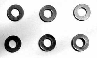 以笔者的感觉来判断,固定散热片的弹簧卡子在力度上还不够,散热片和显示核心接触并不紧密。主要还是显卡及散热片的厚度不大,导致卡子内的弹簧无法充分压缩。于是笔者使用了刚好适合于弹簧卡子大小的螺丝垫(图3),每个弹簧卡子上面加上三个螺丝垫,并按照拆卸散热片的逆顺序,把散热片重新安装在显卡上。这样显卡核心就可以与散热片充分接触,热量的传导自然也就有所改善了。