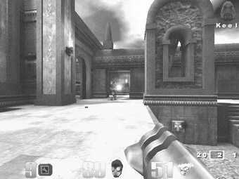 Medium画质,漫射光源与镜面效果以及正常的图层都使用了压缩,看起来仍旧不错,但在一些角落或边缘会因为压缩正常图层引发一些纹理扭曲与失真,这种画质适合使用128MB显存的显卡采用。GeForce FX5900和Radeon9800级别的显卡可以使用这个级别的设置,但要记住不要将分辨率设得高于800×600,否则会出现画面停顿的现象。