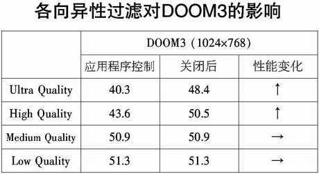 现在我们可以说:DOOM 3在Ultra画质和High画质中自动打开了一定级别的各向异性过滤,而Medium画质和Low画质则没有自动开启各向异性过滤!所以在Ultra画质和High画质下,用户可以在驱动中关闭各向异性过滤来提高一些性能,不过因为只有NVIDIA的驱动里才有关闭各向异性过滤的功能,使用ATi显卡的用户就没办法了。所以对于NVIDIA高端卡测试,我们也将驱动中的各向异性过滤设置为了“应用程序控制”。