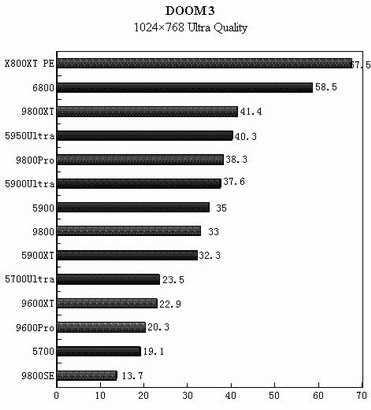 在DOOM3发售之前,关于它的系统要求就传得沸沸扬扬,而John Carmack也在四年的开发过程中不断地更改配置要求,直到8月3号我们在DOOM3的说明书上看到了如下的要求,操作系统要求Windows 2000/XP并且安装DirectX 9.0b,处理器要求Pentium 4 1.5 GHz or Athlon XP 1500+以及更高的CPU,内存要求384MB,显卡要求最好支持DirectX 9.0b以及有64MB或以上的显存,包括从ATi 的Radeon 8500到Radeon X800,所有的 NVIDIA GeForce 3/Ti系列、GeForce 4 MX系列、GeForce 4 Ti系列、GeForce FX系列、GeForce 6800系列。从这个要求上来看DOOM3的适应性是很强的,理论上24帧/秒以上的速度就可以玩游戏。但究竟在实际游戏中各种配置可以达到一个什么样的速度呢?下面我给出系列显卡在DOOM3中的成绩。首先上场的是低端平台。