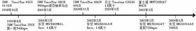 虽然如此,人们却从未停止提升笔记本电脑硬盘容量的步伐:1998年10月,IBM推出第一块容量达到14.1GB的笔记本电脑硬盘──TravelStar 14GS;2000年,IBM又推出首块容量为32GB的产品──TravelStar 32GH;2001年3月,拥有48GB容量的TravelStar 48GH现身市场;2001年11月,IBM又发布了容量为60GB的TravelStar 60GH;2003年3月,富士通公司的MHT2080AT将2.5英寸笔记本电脑硬盘的容量提升至80GB;而在2004年4月,东芝公司又利用型号为MK1031GAS的笔记本电脑硬盘将这一记录改写为100GB。