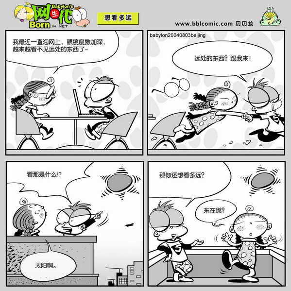 网生代(32):想看多远 网络通信 贝贝龙 · 2004年8月16日 编注:自网生代百期专题向读者征集漫画脚本以来,虫虫收到许多热心读者的投稿。作者贝贝龙为答谢读者,将自己设计的玩具作为奖品,赠送给漫画脚本被采用的读者。欢迎大家继续投稿,投稿信箱:chong@cpcw.com 本期漫画由SKY读者策划,除50元稿费外,他还将获得由贝贝龙独家设计制作的玩具魔法猪一个 (注:魔法猪是贝贝龙系列漫画《魔法猪世纪》中主角阿檬猪的玩具版,详情请参看贝贝龙主页“青蛙帝国”http://www.bblcomic.com)