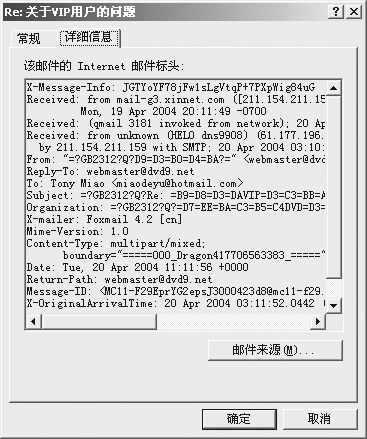 如果无法做到上述两点,你只能通过分析邮件头的信息判断对方是否真正发信。在OE中,我们可以通过“详细信息”选项看到对方发信时的IP地址和发信时所用的SMTP服务器(图4),不过这对于鹿采薇那种采用同一个免费服务器上的SMTP发信的方式仍然是很难防范的。采用邮件加密的方法又需要双方都采用同样的签名认证,也不是很方便。因此,还是在必要的时候多问问朋友,进行一下确认比较好。