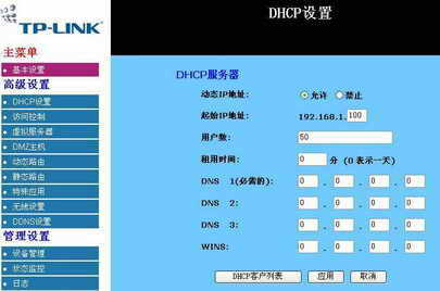首先,在IE浏览器中输入默认的访问地址(http://192.168.1.1),输入用户名和密码(默认用户名为空,密码为“admin”),打开路由器设置窗口。在左侧窗口中点击“DHCP设置”,然后在右侧窗口中的“动态IP地址”区域选择“允许”(图1),为局域网启用DHCP服务器。如果在局域网中已经设置了DHCP服务器,就应选择“禁止”。点击“应用”按钮设置即可生效。