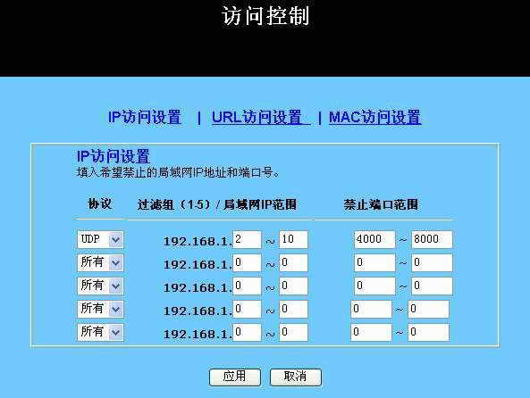 通过无线宽带路由器提供的访问控制功能,可以对网内的所有计算机进行IP访问控制、URL访问控制、MAC访问控制,以便控制它们的上网权限。这些功能对于家庭以及小型办公网络非常实用,这样可以有效地控制小孩或者员工的网络访问权限。