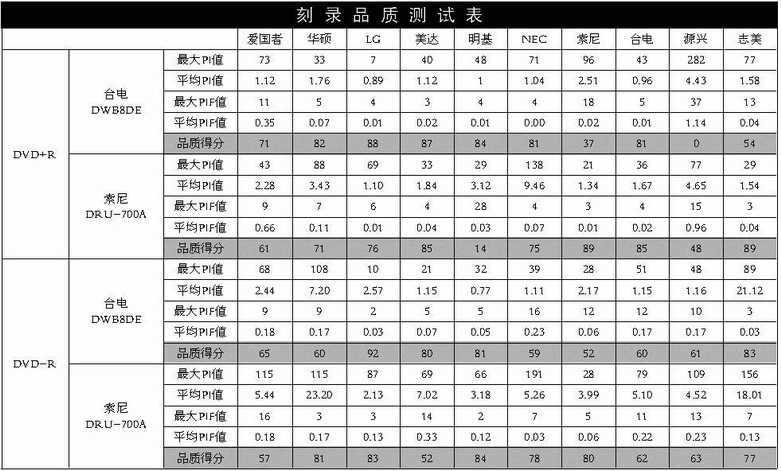 另外,我们还考虑到不同光驱的读盘能力并不相同,有些盘片在这台光驱上也许成绩不佳,但在别的机器上则有较好表现,所以,我们采用了多平台测试综合评定的方式,使用了台电的DWB8DE和索尼的DRU-700A两台DVD刻录机进行PI/PIF读取测试。之所以选择台电DWB8DE,是因为它OEM自中国台湾地区厂商BTC,而BTC的产品在中国内地相当具有代表性,优百特、爱国者等DVD刻录机都出自它。而索尼DRU-700A则源自建兴,也很具有代表性(此次参测的NEC和LG等品牌的DVD刻录机不支持CD-DVD Speed的PI/PIF测试)。