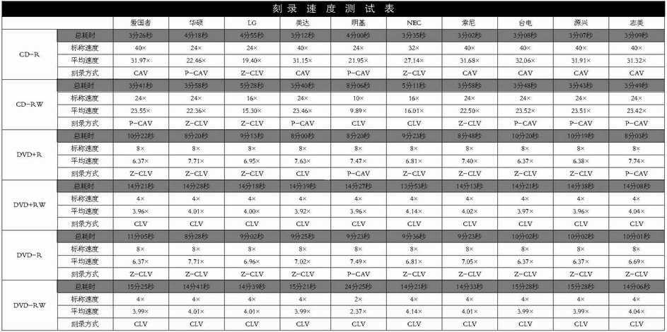 记得早期1×DVD刻录机出现的时候,不少人喊“痛苦”。的确,刻满一张DVD要近1个小时时间,的确痛苦。所以,DVD刻录机不断提速,以满足消费者对速度和效率的追求。我们在此次评测中引入了刻录速度测试,将提供各款产品的标称速度、刻录方式和刻录的实际速度。由于目前CD-R/RW刻录已经够快,大部分刻录机3~5分钟就能搞定CD-R/RW光盘,所以,我们的测试重点主要放在DVD刻录速度上。我们将依据各参测产品的DVD+R/RW、DVD-R/RW刻录速度,作出综合评价。但同时,我们也提供了CD-R/RW的实际刻录速度,以做参考。
