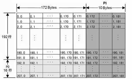 从图中我们可以看到,ECCB中的数据区为192行,而每行,有172列(字节)。每一行的172个字节横向生成10个字节的PI校验码(内部校验码),而每一列的192个字节又纵向生成16个字节的PO校验码(外部校验码),最后,每一行PO校验码再生成10个字节的PI校验码,从而构成一个完整的ECCB。这时,ECCB共有208行(192+16)和182列(172+10)。