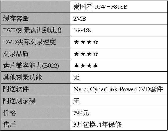 爱国者RW-F818B源自BTC英群科技,支持40×CD-R写、24×CD-RW覆写,8×DVD±R写和4×DVD±RW覆写。该产品在送测时,采用的是B022的固件,所以,在盘片兼容测试时,出现了对两类盘片不能正常支持的情况。