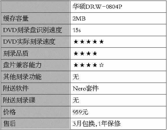 华硕的DRW-0804P采用的是先锋的技术,在1.19版固件下,通过了全部盘片的识别测试。而且,它的刻录速度非常快,4×DVD±RW的覆写速度都超过了标称的4×,达到了4.01×,而在进行DVD±R写入时,启动速度为6×,然后迅速提升到8×并稳定在该速度上,所以,它的平均速度达到了惊人的7.71×,总耗时仅8分20秒左右,DVD综合刻录速度位居参测产品的榜首!